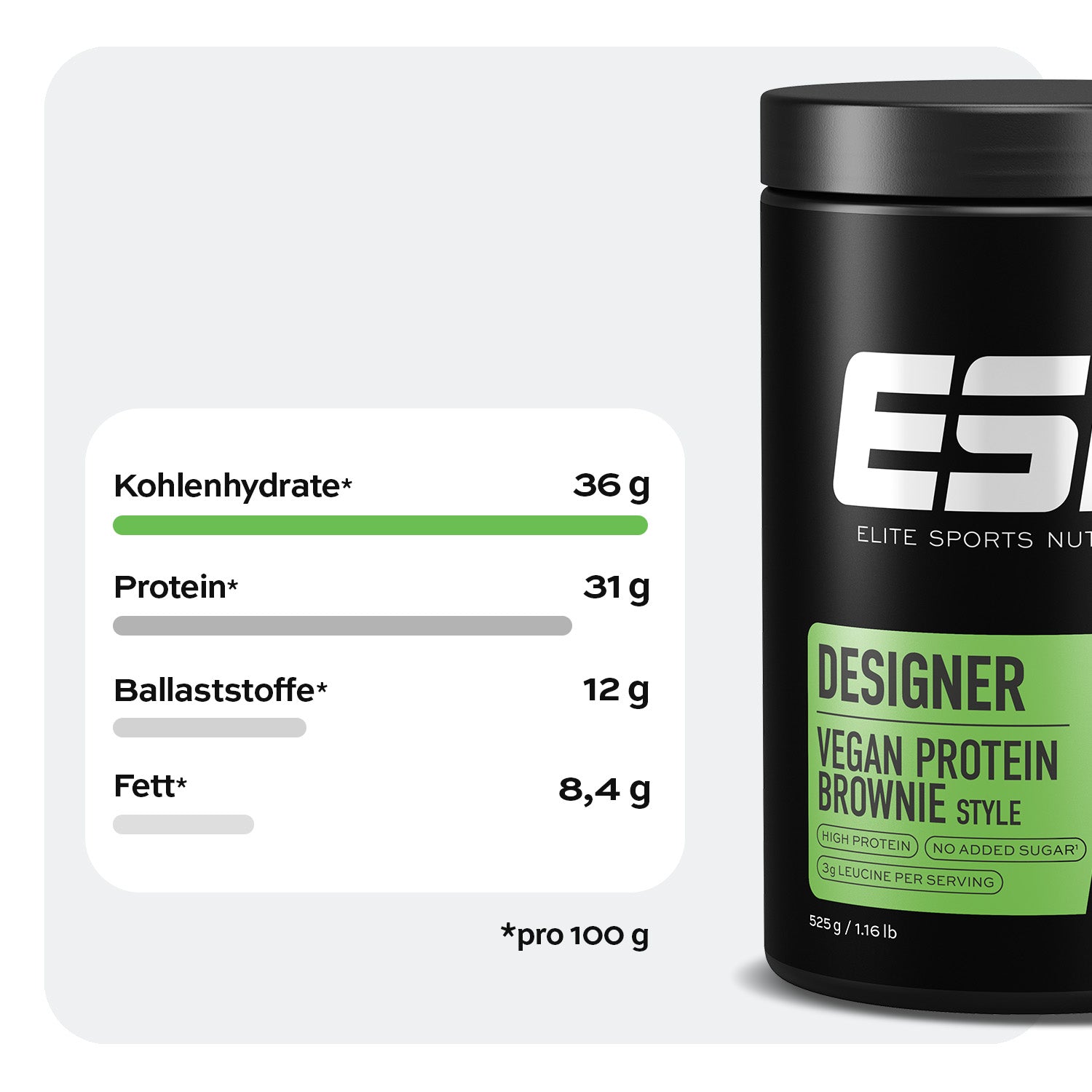 Kakaopulver 28 % (stark entölt), Süßungsmittel (Erythrit, Sucralose), Erbsenprotein 19 %, glutenfreies Hafermehl, Reisproteinkonzentrat 5 %, Zartbitterschokoladentröpfchen mit Süßungsmittel 4,4 % (Kakaomasse, Süßungsmittel (Maltit), Kakaobutter, Emulgator (Lecithine (Raps))), Aroma, L-Leucin 2,2 %, Sonnenblumenprotein 1,9 %, Kürbiskernprotein 1,3 %, Flohsamenschalenpulver, Verdickungsmittel (Xanthan), Säuerungsmittel (Citronensäure), Salz, Backtriebmittel (Natriumhydrogencarbonat). Herkunft Zutaten: EU/Nicht-EU.Designer Vegan Protein Brownie Style Key-Facts