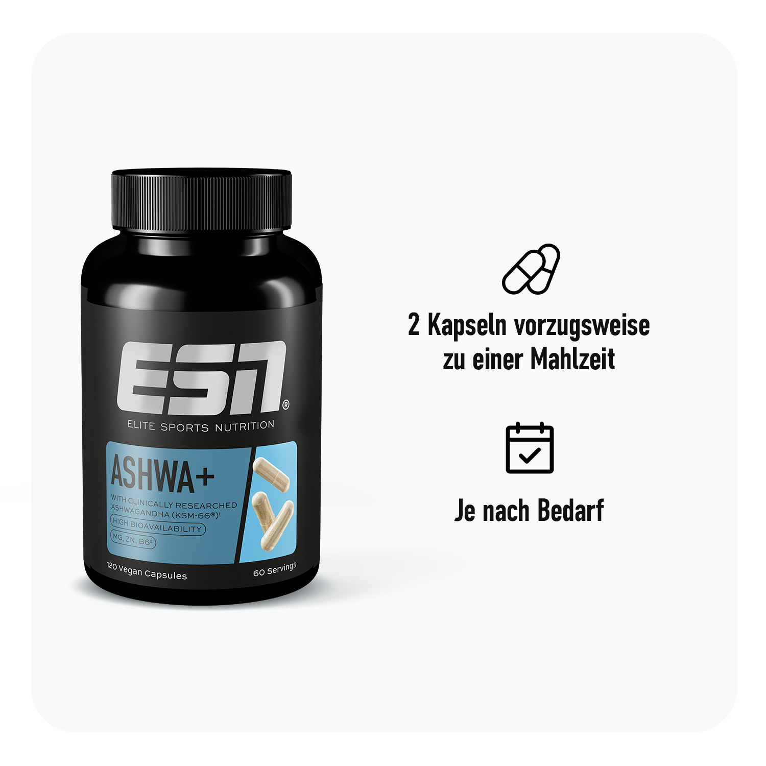 Antioxidative stress control – mit unserem Ashwa+. Wir haben patentiertes Ashwagandha (KSM-66®) mit Anti-Stress-Nährstoffen für mentale Balance und Zellschutz kombiniert.1,2,3 Der ideale Support, den du bei harten Workouts oder einem stressigen Alltag brauchst.