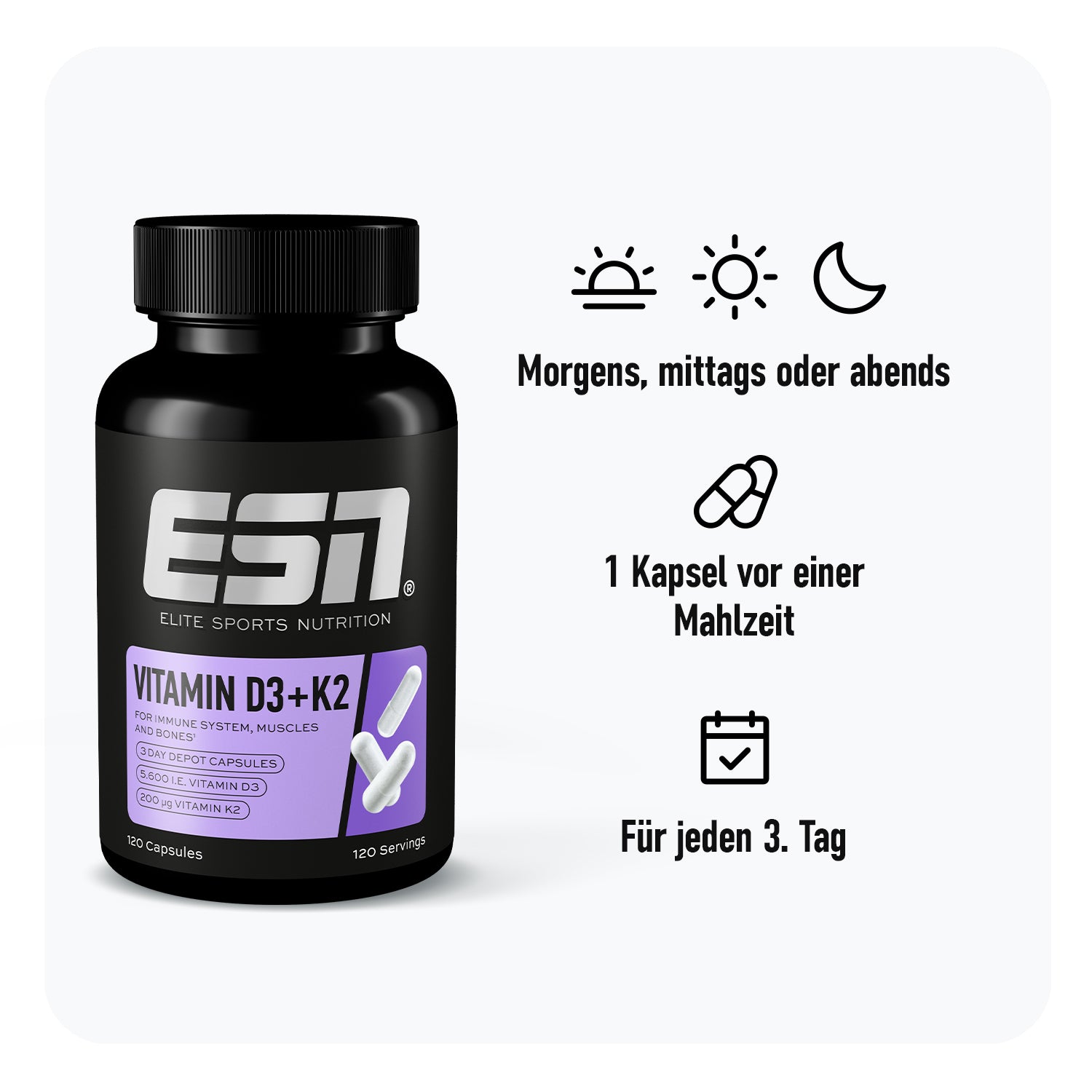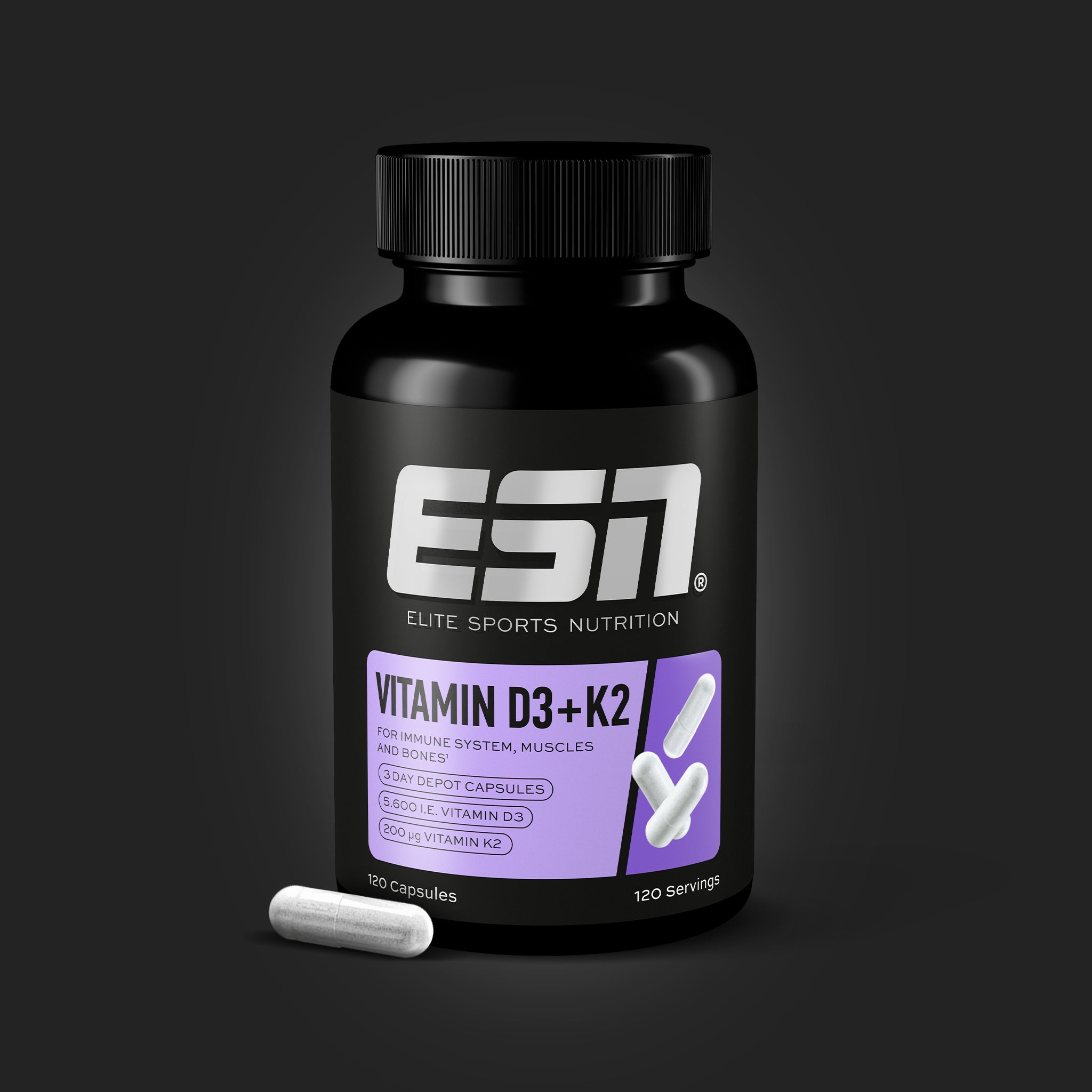 Vitamin power duo: Vitamin D3+K2. Die Kombi aus den Vitaminen D3 und K2 unterstützt effektiv deine Knochen, Muskeln, Immunsystem und Blutgerinnung.1,2 Der ideale Support für deine Performance-Base und das mit nur einer Kapsel alle drei Tage.