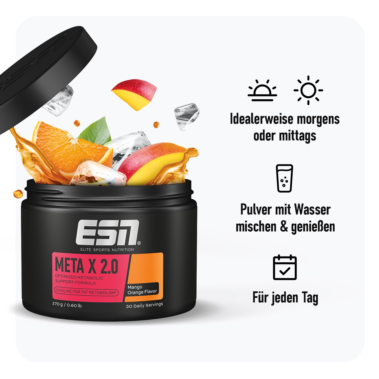 Säuerungsmittel (Citronensäure), L-Tyrosin, L-Carnitin-Tartrat, Natriumbicarbonat, Aroma, Matetee-Extrakt, Citrus Aurantium-Extrakt, Glycin, Süßungsmittel (Acesulfam K, Sucralose), Grüntee-Extrakt, Cholinbitartrat, Farbstoff (Carotin), Pomelo-Extrakt, Bioflavonoide aus Citrusfrüchten, Quercetin-Dihydrat, Pflanzenextraktpulver (Panax notoginseng-Extrakt, Astragalus membranaceus-Extrakt), Schwarzer Pfeffer-Extrakt, Niacin (Nicotinamid), Natriumselenit.Key Facts – Meta X 2.0