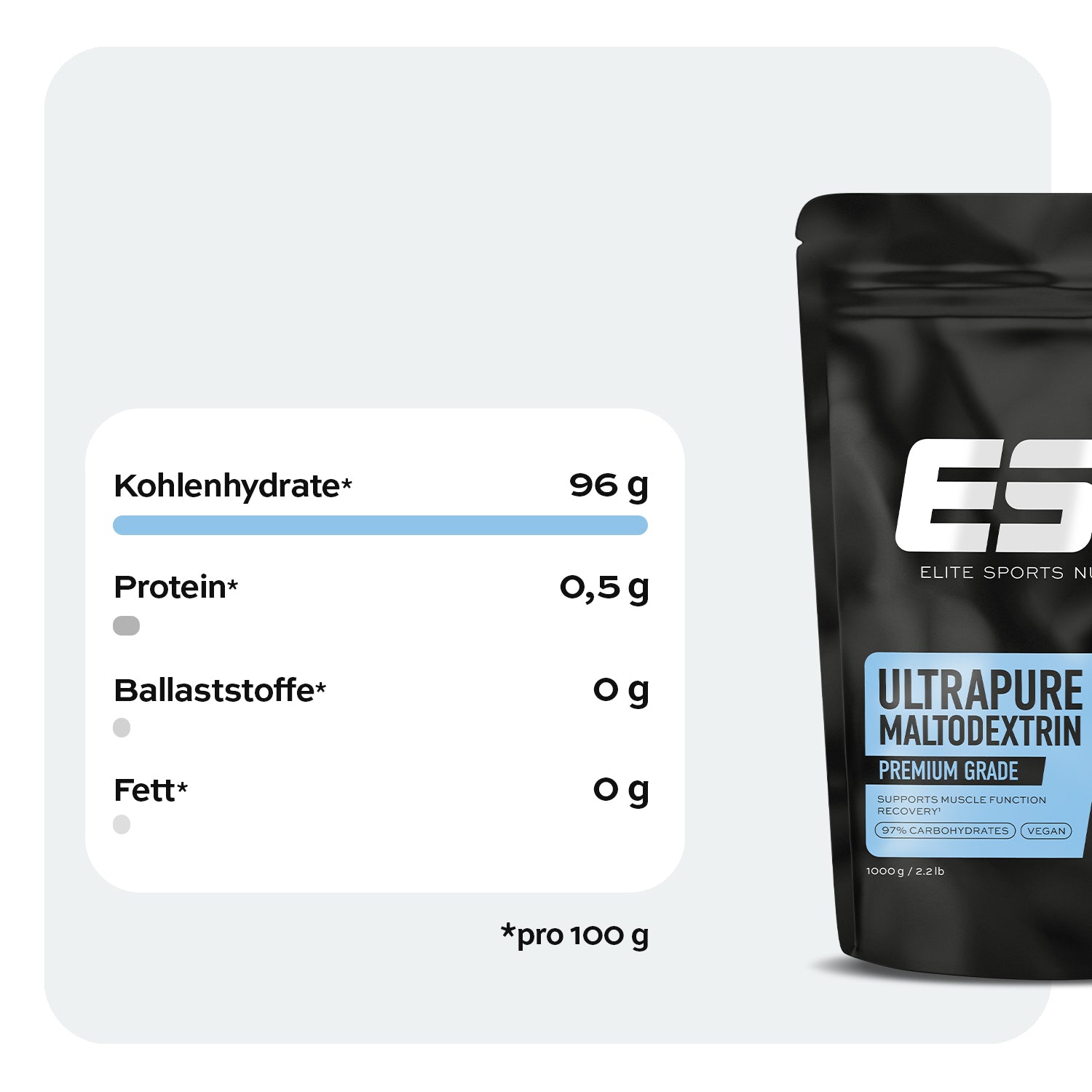 Ultra energy, ultra performance – mit unserem Ultrapure Maltodextrin. Es liefert dir schnelle Energie, wann immer du sie brauchst: Als Pre-Workout sorgt es für maximale Power, während des Trainings hält es dein Energielevel aufrecht und nach dem Training füllt es deine Glykogenspeicher auf für eine optimale Regeneration der Muskelfunktion.1