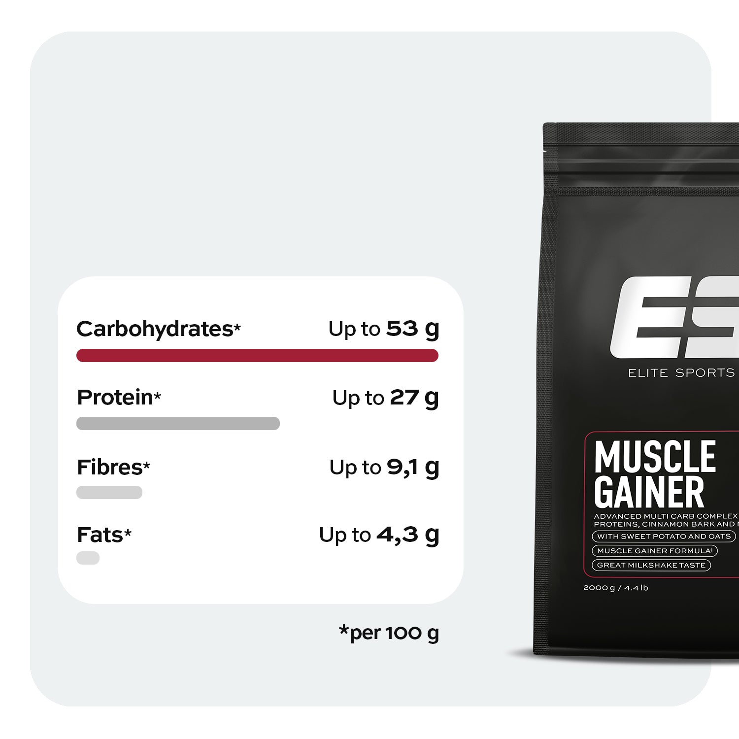 Next-level support for muscle growth: The Muscle Gainer is our most effective formula for maximum gains. 500 calories, a multi-carb complex for lasting energy, premium proteins, and a quality fat source. The perfect shake for your bulking phase, with a deliciously creamy texture. 12 Made for maximum results.