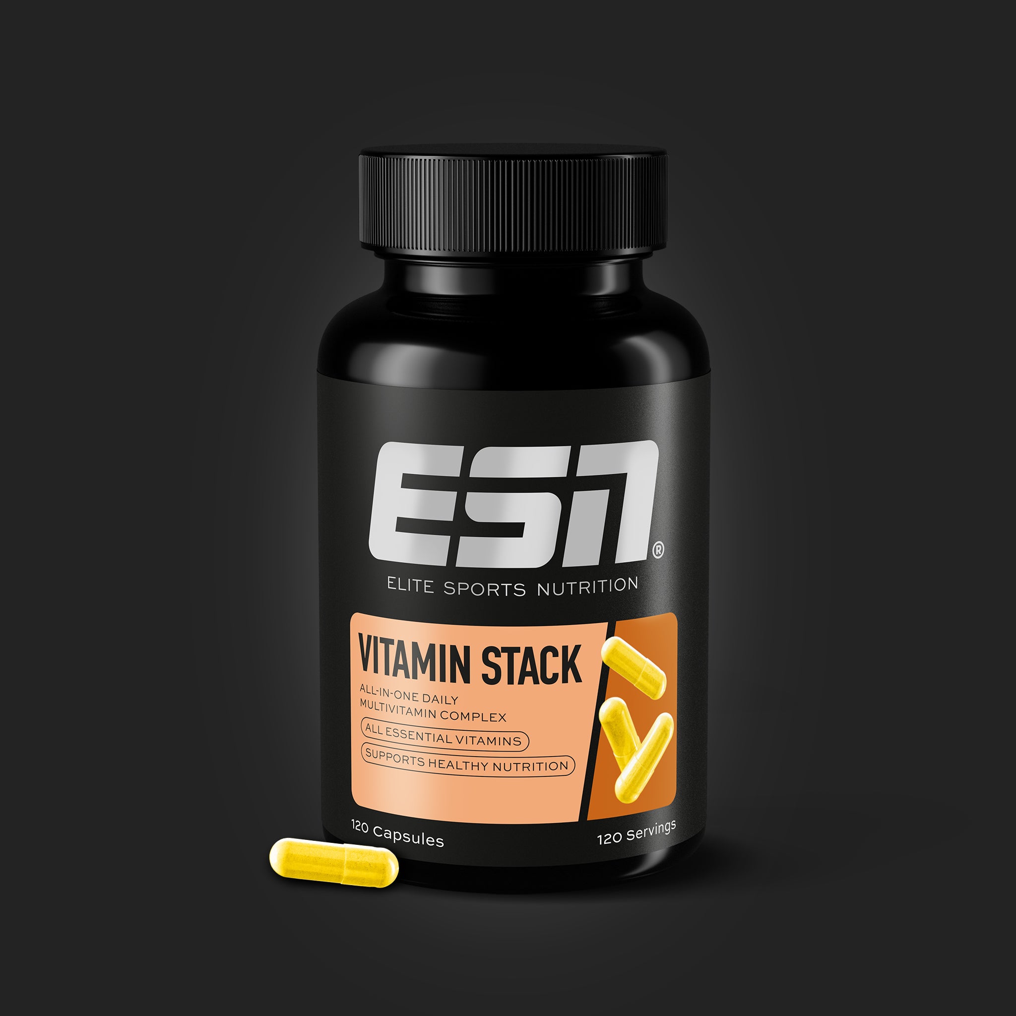 Mieszanka Witamin [Witamina C (Kwas L-askorbinowy), Środek przeciwzbrylający (Celuloza mikrokrystaliczna), Niacyna (Nikotynamid), Witamina E (Octan DL-alfa-tokoferylu), Kwas pantotenowy (Wapń-D-pantotenian), Biotyna (D-biotyna), Witamina A (Octan retinylu), Witamina D3 (D3/Cholekalcyferol), Witamina B12 (Hydroksykobalamina), Witamina B6 (Chlorowodorek pirydoksyny), Ryboflawina (Witamina B2), Tiamina (Mononitrat tiaminy), Witamina K1 (K1/Fitomenadion), Kwas foliowy (Kwas pteroilomonoglutaminowy)], Skorupa kapsułki (Środek glazurujący (Hydroksypropylometyloceluloza))Kluczowe fakty dotyczące Vitamin Stack