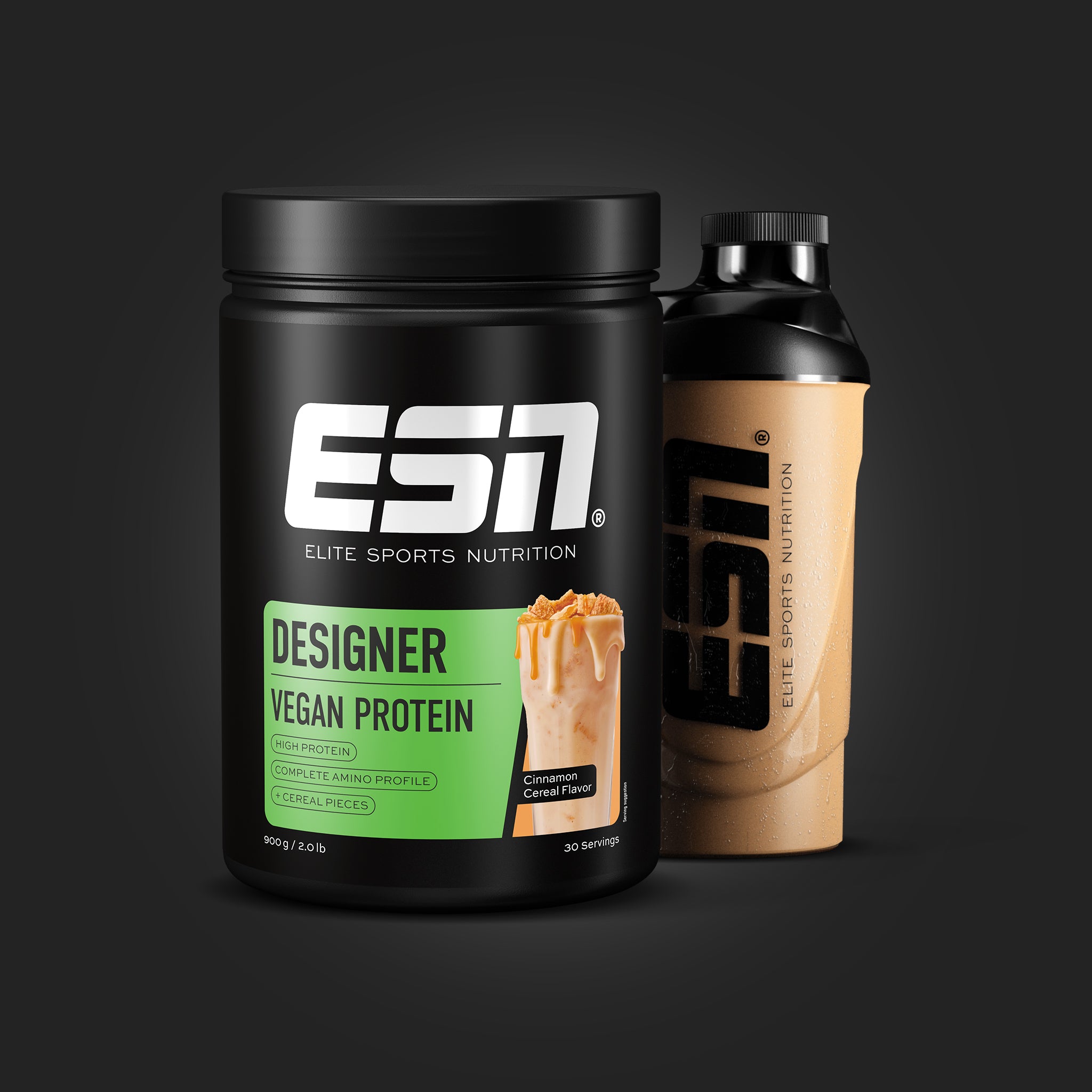 Białko sojowe 81%, L-Leucyna 10%, Aromaty, Kawałki zbożowe 4% (Mąka pełnoziarnista pszenna, Mąka ryżowa, Cukier, Olej palmowy, Dekstroza, Skrobia kukurydziana, Deksryna, Cynamon, otręby pszenne, Sól, Mąka jęczmienna), Słodziki (Sukraloza, Glikozydy stewiolowe z stewii). Pochodzenie składników: UE/poza UE.Kluczowe fakty - Vegan Designer Protein