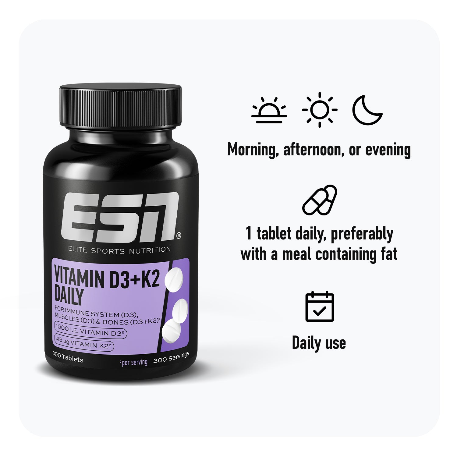 2 witaminy, 1 misja: Witamina D3+K2 Daily. Witamina D3 wspiera Twój układ odpornościowy, mięśnie, dodatkowo witamina D3 i witamina K2 wspomagają Twoje kości – wszystko, czego potrzebujesz na co dzień i podczas treningu.1 Dzięki praktycznym pojedynczym tabletkom możesz elastycznie i indywidualnie dostosować swoje spożycie.